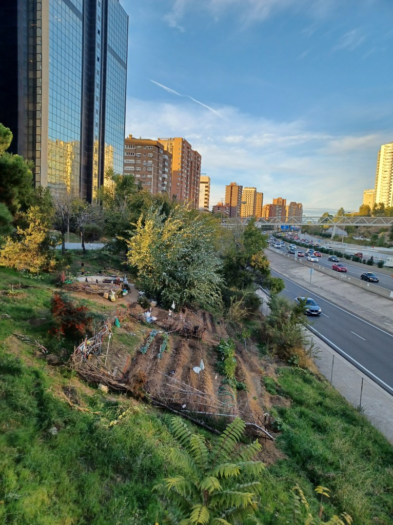Los 32,5 kms de la calle 30 – antes avenida de la Paz , antes M-30- pueden dar mucho de sí amén de ver pasar por su asfalto cada día 305.000 vehículos. Dan, por ejemplo, para que florezcan en sus amplios y camperos márgenes, miles de árboles y, lo último, cuidados huertos, lo que ahora llaman “huertos urbanos”. El que señalamos aquí está en el sector norte, a la altura del nudo de la Paloma, en la parte posterior de la Avenida de Burgos, ya cerca de la M-11. Una fila de rascacielos por un lado – letrero “Agencia EFE” en uno de ellos- y la tan ruidosa autovía por otro.