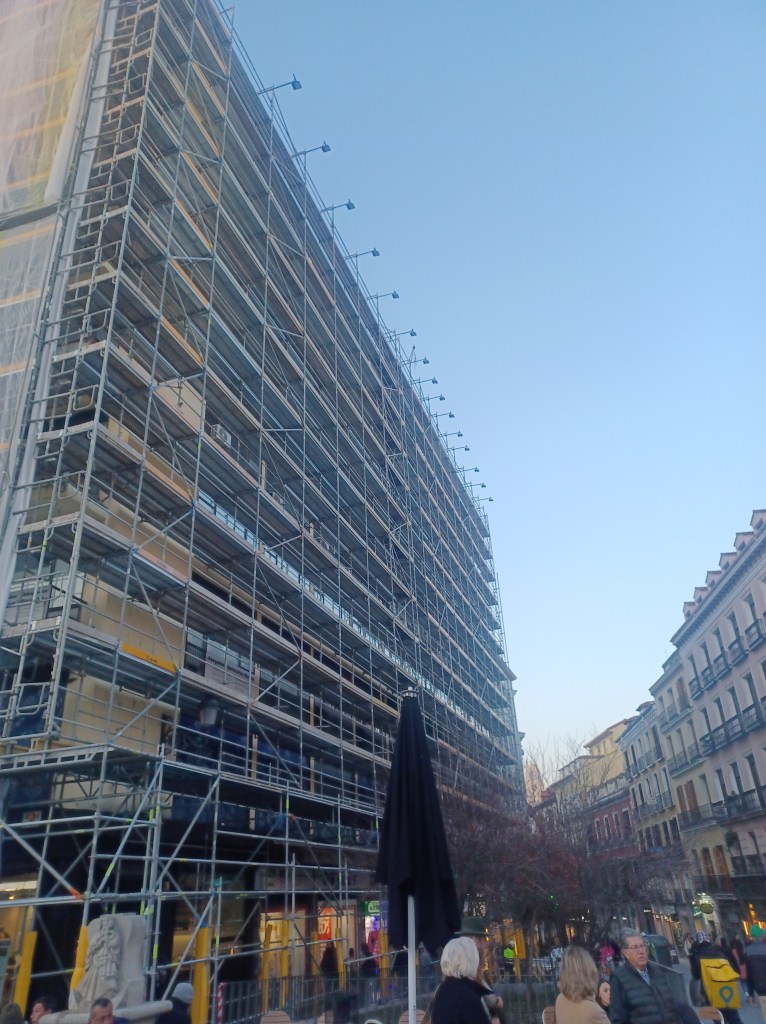 En otro lugar de UveMadrid escribí sobre ese edificio horroroso situado en la plaza de Benavente esquina con la calle Carretas. Pues bien, ese edificio está ahora en obras, cubierto de andamios. ¿ Que van a hacer ? Pues supongo que lavarle la cara, adecentarle. Vamos, nada. Quitarle la mugre, la cartelería abandonada y poco más Pero, visto lo visto y aprovechando esta feliz circunstancia ¿porqué no lo tiran? ¿ Porqué hace un edificio acorde con los edificios monumentales que hay en la plaza ? Parece un dislate, una locura, un sueño. ¿ Pero cuantos palacios magníficos, edificio singulares se ha llevado la piqueta sin que a nadie le pareciera un dislate, una locura, un sueño? ¿ No tiraron la Isla, el mercado de la cebada, el hotel Florida, el circo Price, el barrio de Pozas entero, el palacio de los duques de Medinaceli y tantos y tantos edificios notables sin que nadie levantara la voz ? Pues eso.