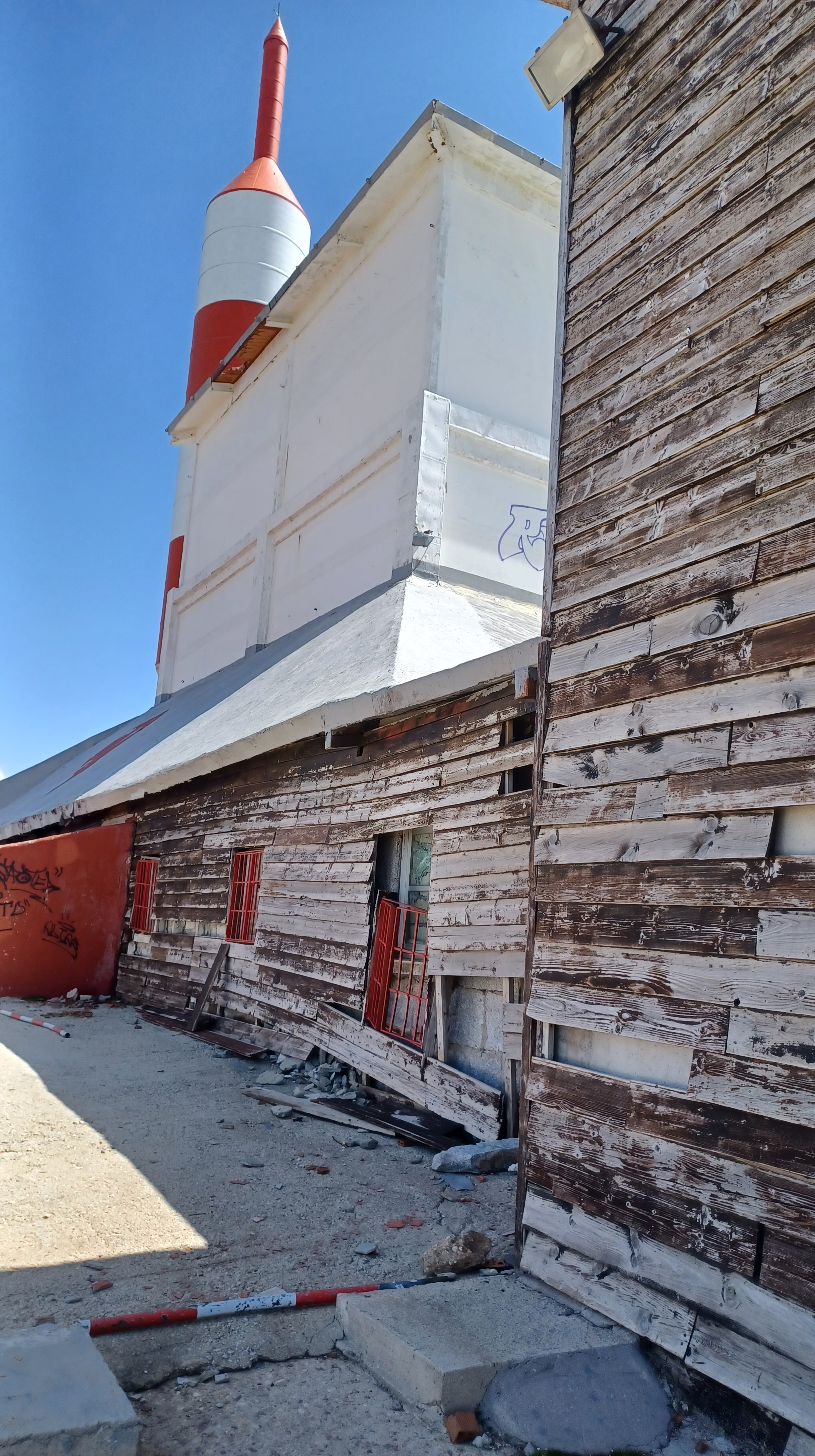No hay más que acercarse a la valla que rodea las instalaciones del repetidor de radio y televisión de Guadarrama – la llamada Bola del Mundo- para darse cuenta de su abandono, de su lamentable estado de conservación. Graffitis, vallas caídas, paredes derrumbadas, desconchones en los tejados, maderas podridas….Hace unos años, nadie se atrevía a acceder al recinto. Todo el mundo respetaba las señales de prohibido el paso, propiedad privada o atención campo electromagnético. Se notaba que estaba cuidado y vigilado. Ahora, la mayoria de las personas que llegan a la cumbre de Guarramillas, y son masas, se acercan a la instalación para verla de cerca, para hacer alli lo que les venga en gana